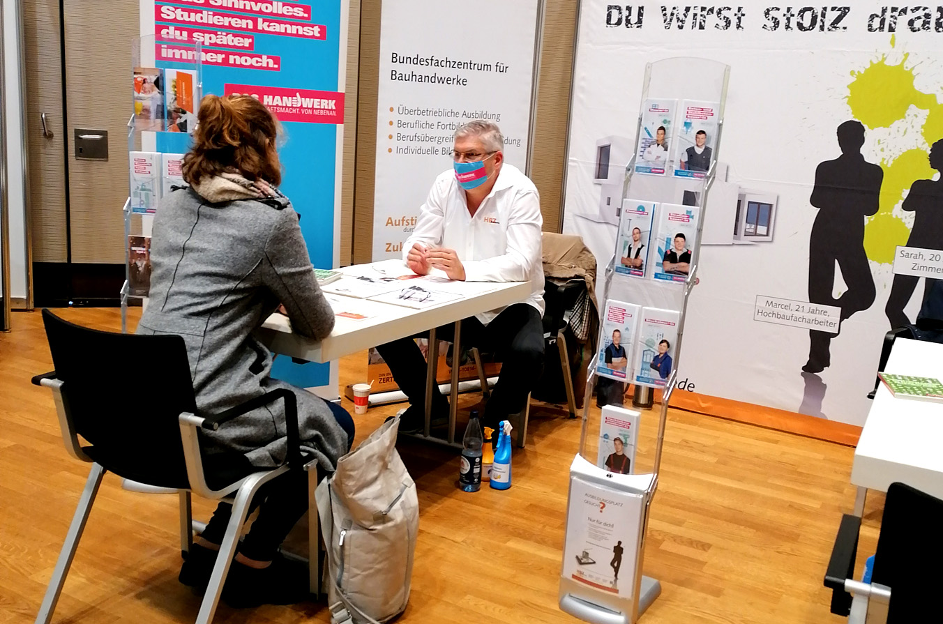 Die Fachmesse für Ausbildung und Studium (vocatium) fand vom 7. bis zum 8.10. erstmalig in der Stadthalle Gütersloh statt. „Wir sind froh, auch zu Corona-Zeiten Teil so eines Angebots sein zu können“, sagte Markus Ortmann (Projektmitarbeiter). Gut organisiert und Corona-Regeln einhaltend konnten sich die Mitarbeiter*innen des HBZs und des MBZs auf ihre Beratungskompetenz konzentrieren: Informationen über die Berufe des jeweiligen Fachbereichs weitergeben. Für das HBZ stand vor allem Herr Ortmann den jungen Menschen aus dem ganzen Landkreis Gütersloh, aber auch über ihn hinaus, Rede und Antwort. Während am ersten Tag das Hauptaugenmerk der Schülerinnen und Schüler unterschiedlicher Schulformen auf dem Fliesen-, Platten- und Mosaiklegerberuf lag, waren sie am zweiten vor allem am Zimmererberuf interessiert. Es wurde aber auch über den Maurer*in, Stahlbetonbauer*in, Straßenbauer*in oder Stuckateur*in informiert. Im Gegensatz zu letztem Jahr gab es vermehrt Anfragen zum dualen Studium.